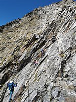 Druga skupina se je napotila na 2420 m visoki Špik Hude police, prvo skupino pa je pot vodila čez pašnike, mimo Škrbine (2201m), od koder pogled seže v zahodne globeli Klapadorije, na melišča visoko pod Montaževimi južnim ostenjem. Vso pot so nas spremljali žvižgi svizcev in radovedni pogledi kozorogov, ki so se pasli ob robu melišča. Dobrih sto metrov više smo stopili v skale. Zdaj je šlo pa zares. Nadeli smo si varovalne komplete in čelade ter »vklopili pogon na vse štiri«. Žičnih vrvi in klinov ni bilo prav veliko, še največ železja je v dobrih 60 m visoki Pipanovi lestvi, ki nas je preko navpičnega skalnega praga pripeljala na enega najlepših grebenov v Julijcih. Še dobre pol ure in stopili smo na vrh (2753 m), označen z železnim križem in zvončkom »za gorniško srečo«, postavljenem v spomin tržaškemu alpinistu Riccardu Deffarju. Občutki in razgledi so bili nepopisni. V daljavi so nas pozdravljali Triglav, Jalovec, Mangart, dolgi greben Kanina, vrhovi Karnijskih Alp, Visokih Tur, Dolomitov,…pod nami so ležale doline Dunja, Zajzera, Reklanica,….pogled je segel vse do morja….